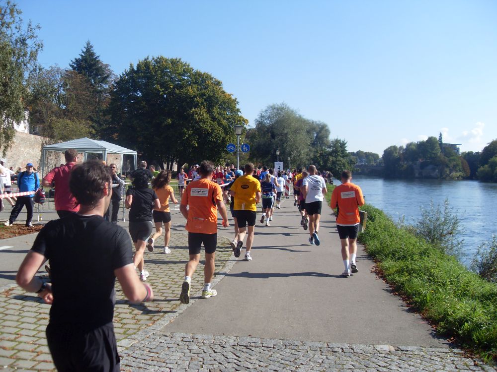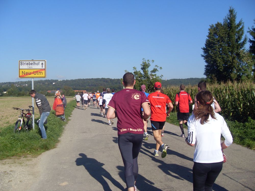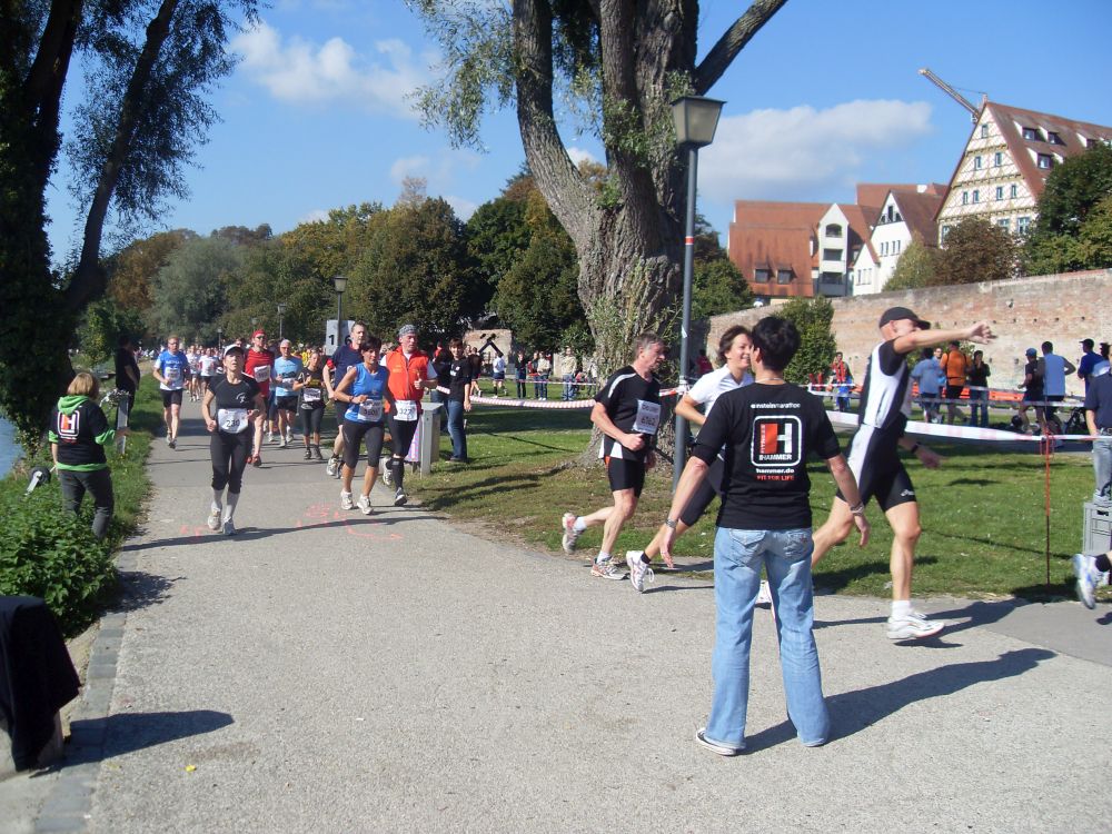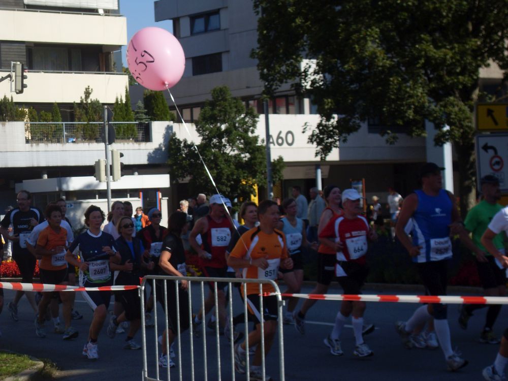 | …Brücke über die Donau, der erste Anstieg, Sonne wärmt zusätzlich, Betriebstemperatur erreicht, glücklicherweise kommt schon der erste Verpflegungsstand = (VPS). Der unendliche Läuferwurm durchquert schon Pfuhl, Begeisterung der Einwohner, klasse, gedrängt stehen sie am Rand. Zeit vergeht viel zu schnell… apropos schnell: ich laufe vor dem rosa Ballon. – Dieter: wirken schon Deine Körner? |