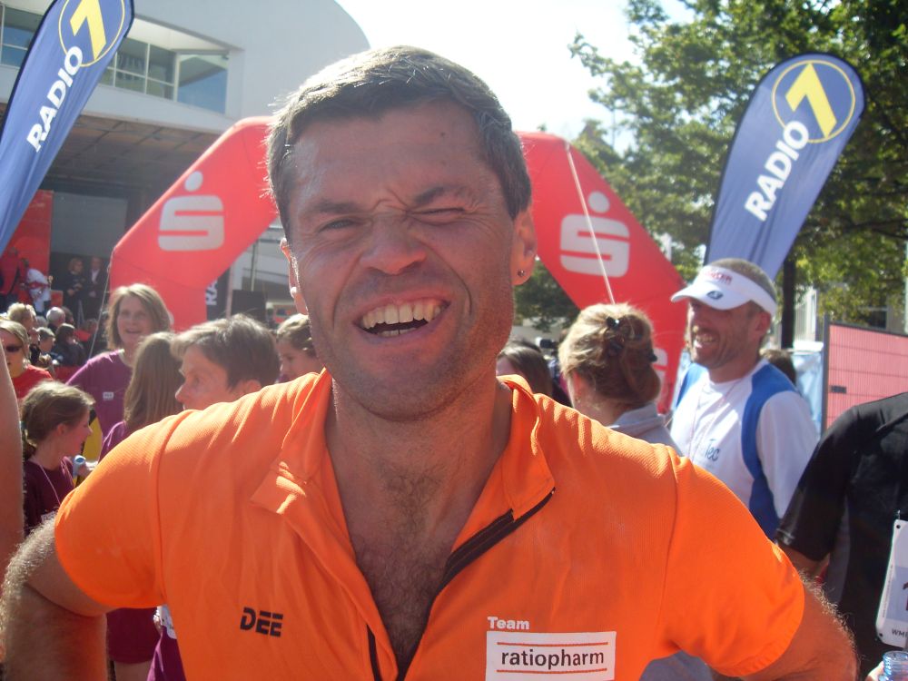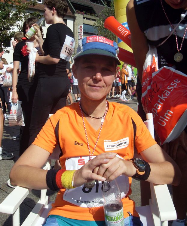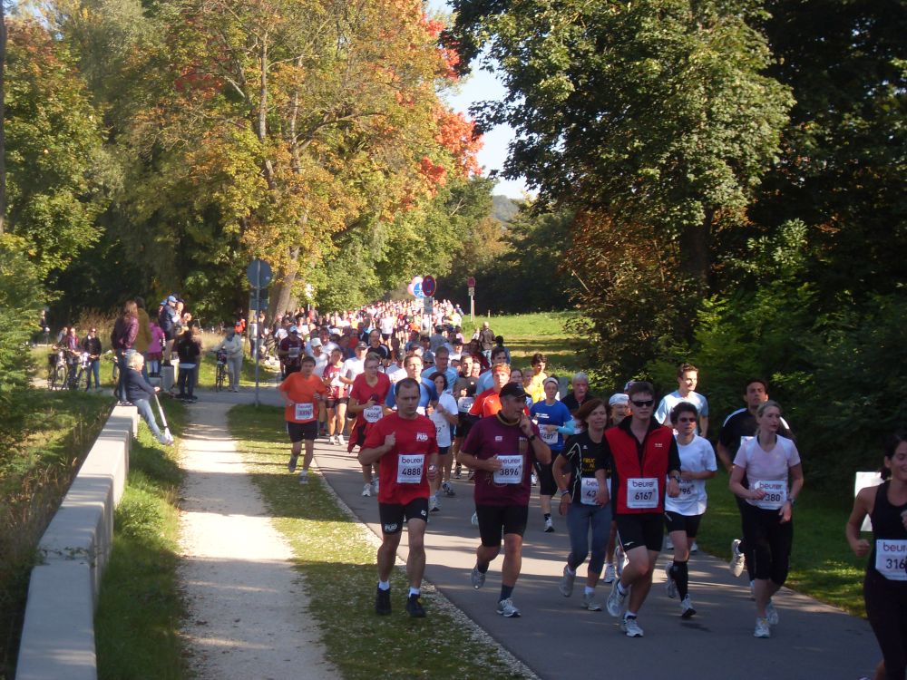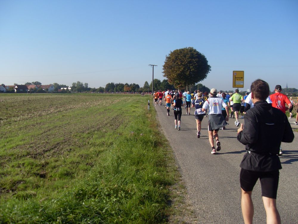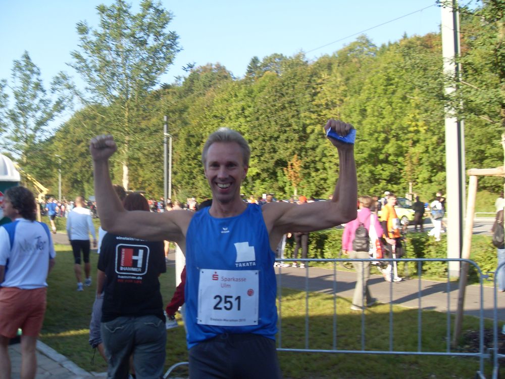 | …Brücke über die Donau, der erste Anstieg, Sonne wärmt zusätzlich, Betriebstemperatur erreicht, glücklicherweise kommt schon der erste Verpflegungsstand = (VPS). Der unendliche Läuferwurm durchquert schon Pfuhl, Begeisterung der Einwohner, klasse, gedrängt stehen sie am Rand. Zeit vergeht viel zu schnell… apropos schnell: ich laufe vor dem rosa Ballon. – Dieter: wirken schon Deine Körner? |