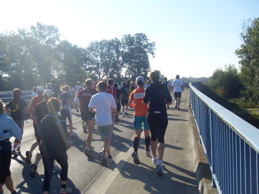 | …ich ziehe, ja Dieter, zieeeeehhhhen, ich fliege, komme der gefühlten Sollzeit von 3:30 locker entgegen…hab sogar den Weihnachtsmann überholt, komme bei km 40 an, die Oberschenkel brennen,Cola rein – Zucker! Gepuscht geht’s weiter….Schattenlaufen im Colarausch auf der Brücke |
