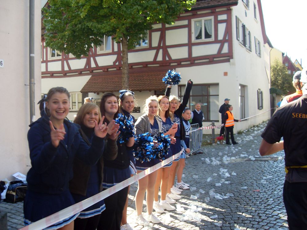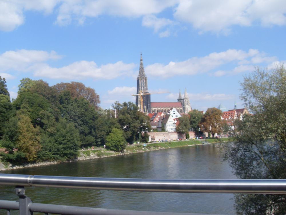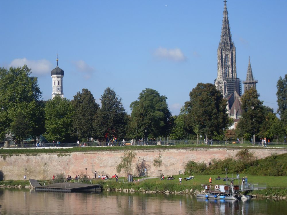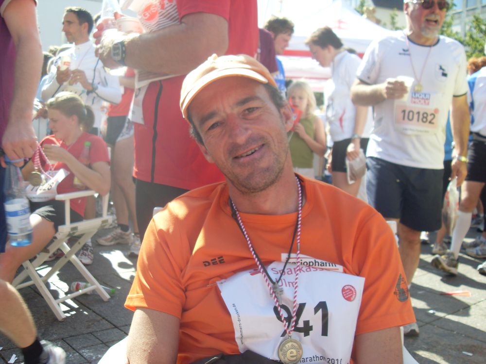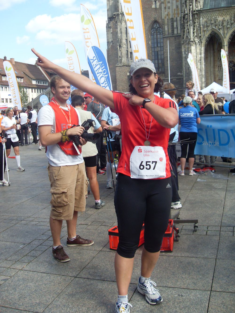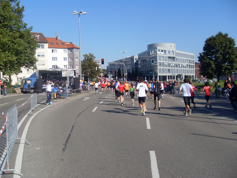 | …größere Mädels feiern einen an mit den blauen „Buschel´s“…da heißt es locker aussehen, keine Anstrengung zeigen, Tempo erhöhen!...mein Ballon kommt entgegen, Zeit gutgemacht, gefühlte 10 Min. …(real: 0 streichen!)…Dreifaltigkeitskirche und Ulmer Münster und darunter schon die schnellen „Rennpferde“ des Marathons….ich „Ackergaul“!... |