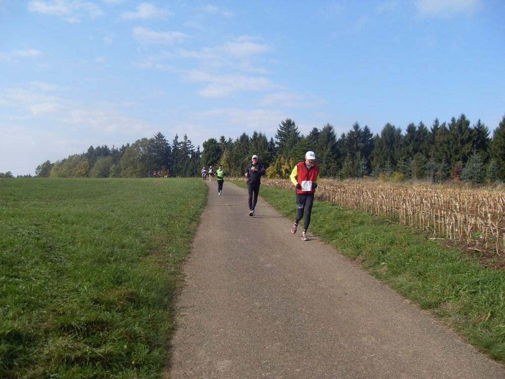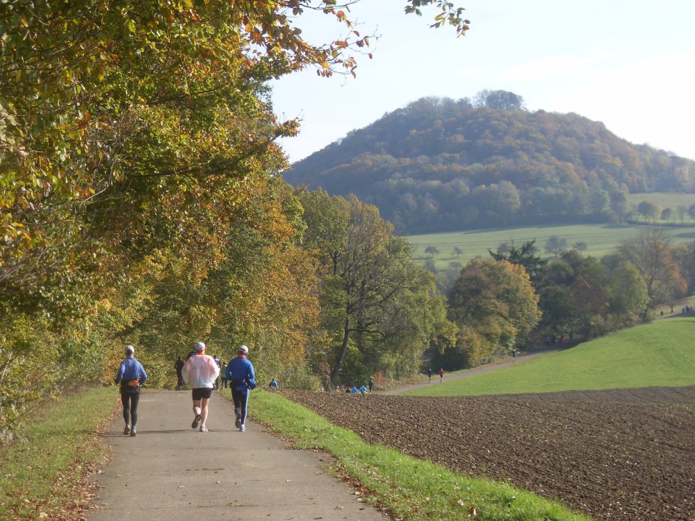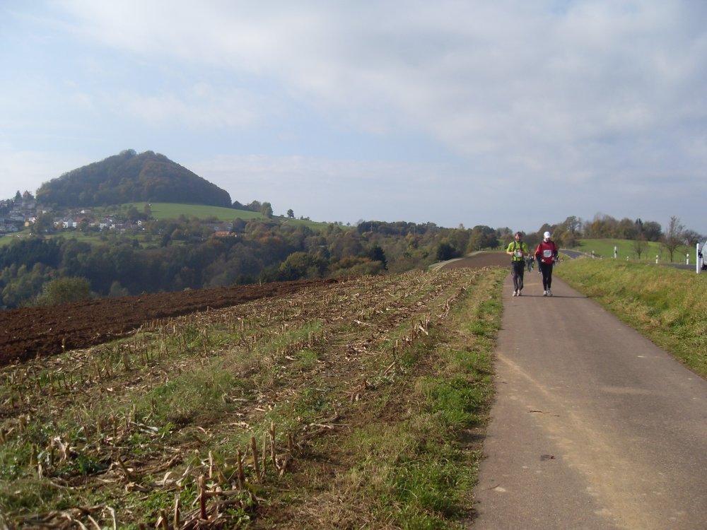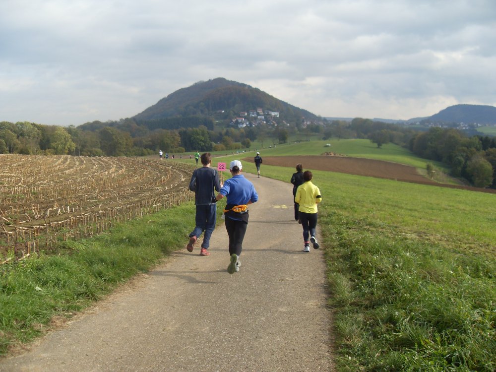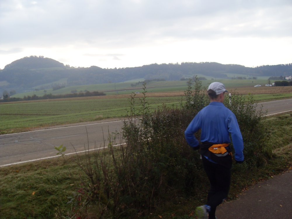 | ...um den Stuifen herum, dann hinauf im Kriechgang, sehr gut für MM´S (müde Muskeln), Sabine macht Tempo, oben auf´m Berg hächle ich Ihr irgendetwas entgegen, Sie bräuchte auf mich nicht warten...und schon ist sie wech! Ab KM 31 Qual, ich bin ein Geher - nicht´s geht mehr, anlaufen, schon der Gedanke schmerzt, 10Meter Joggen, wenn überhaupt man das so bezeichnen kann, ehr ein fast auf der Stelle traben. Ein Mitläufer gefunden - Mitgeher, gleiches Leidensbild. Die Straße, die breite, erweckt in mir keine richtige Freude, ein Gel im "Däschle" noch gefunden: Natrium und Koffein! Beides absolute Mangelerscheinung bei mir, Tank leer, "empty! aber voll-leer! bei KM 35 kommt ein Stand.... |