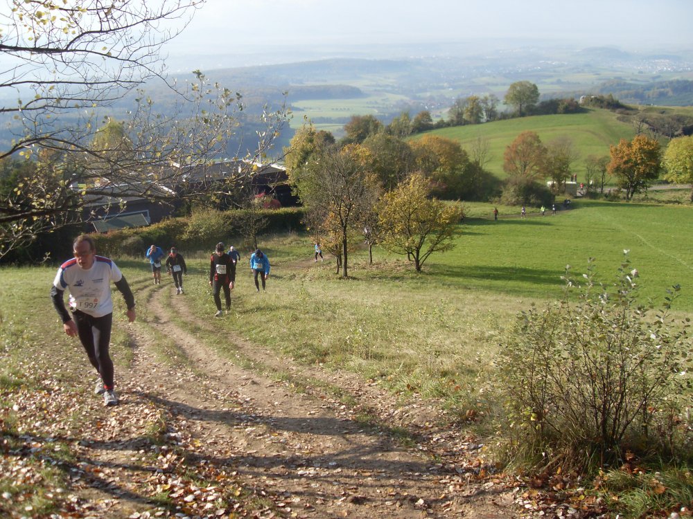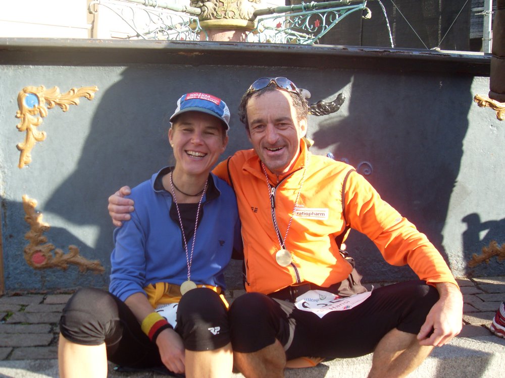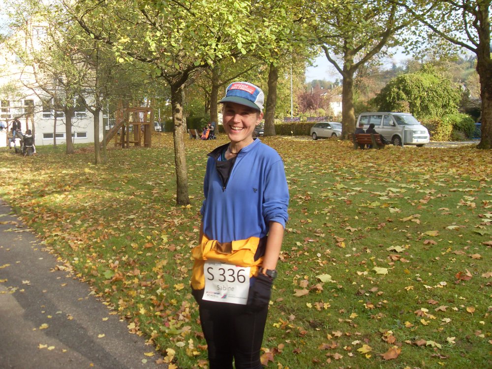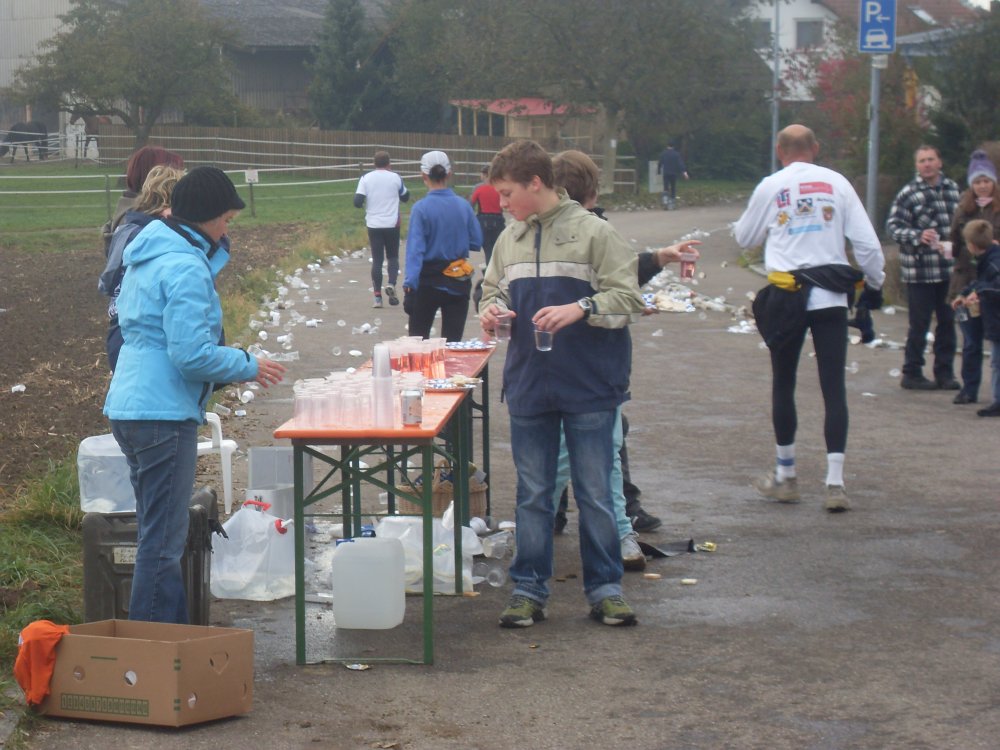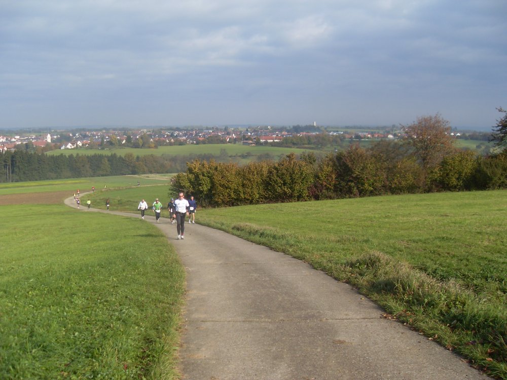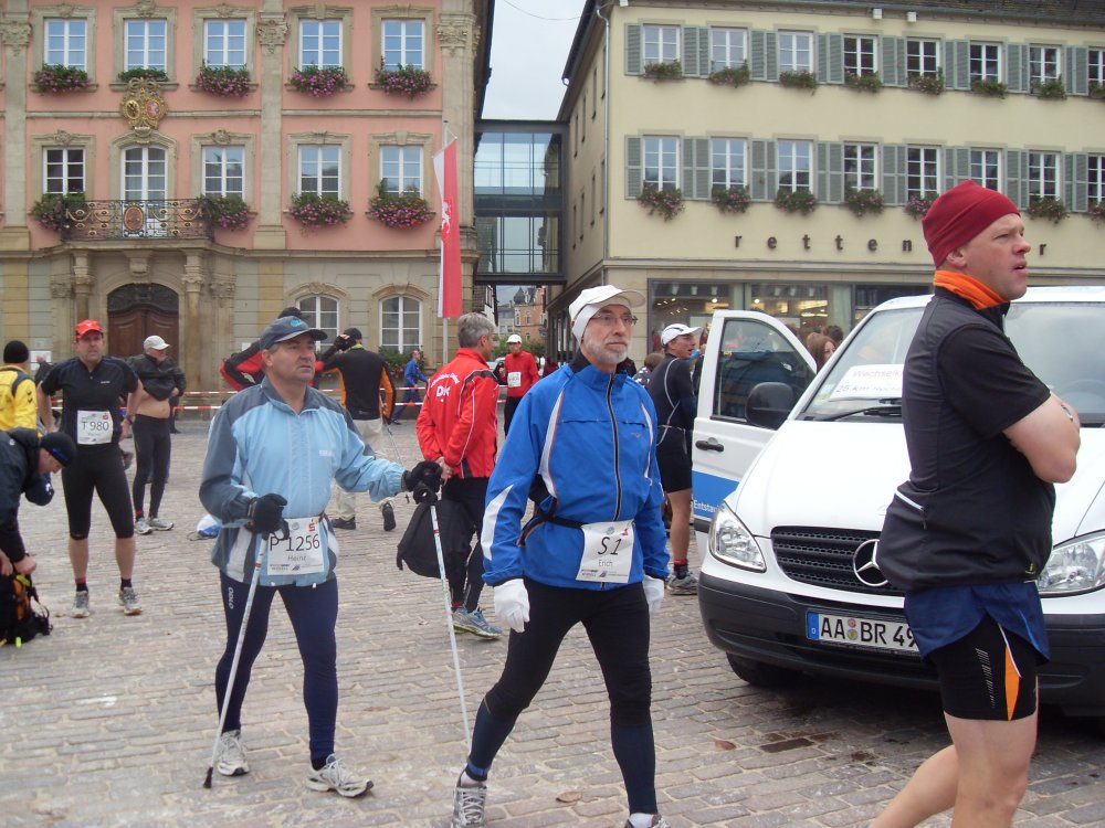 | ...um den Stuifen herum, dann hinauf im Kriechgang, sehr gut für MM´S (müde Muskeln), Sabine macht Tempo, oben auf´m Berg hächle ich Ihr irgendetwas entgegen, Sie bräuchte auf mich nicht warten...und schon ist sie wech! Ab KM 31 Qual, ich bin ein Geher - nicht´s geht mehr, anlaufen, schon der Gedanke schmerzt, 10Meter Joggen, wenn überhaupt man das so bezeichnen kann, ehr ein fast auf der Stelle traben. Ein Mitläufer gefunden - Mitgeher, gleiches Leidensbild. Die Straße, die breite, erweckt in mir keine richtige Freude, ein Gel im "Däschle" noch gefunden: Natrium und Koffein! Beides absolute Mangelerscheinung bei mir, Tank leer, "empty! aber voll-leer! bei KM 35 kommt ein Stand.... |