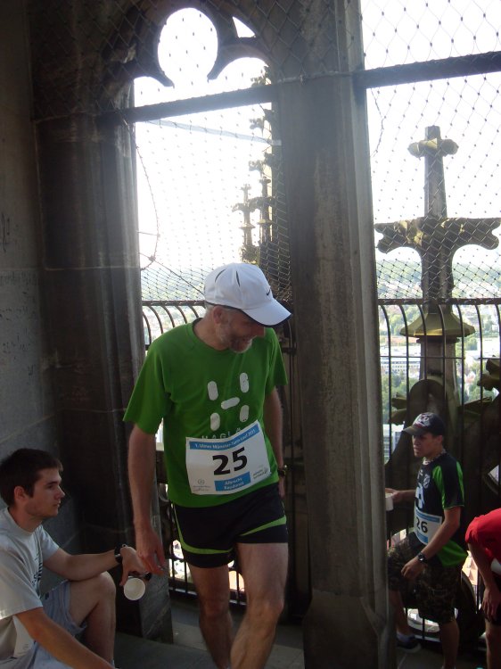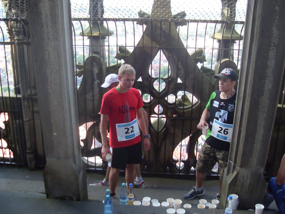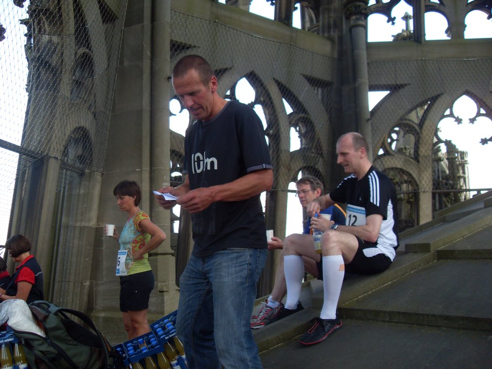 | ...auch die anderen "Sky-runners" sind fertig. Bester Spruch vom Bernd auf 102 Meter "da ist doch der Widdersteinlauf ein "Scheißdreck" dagegen" der Albrecht fand in diesem Moment keine Worte, die meisten husteten nun den alten Staub aus den geschindeten Lungen...hust...huschd...Versorgungsstand hier oben wichtig um den Staub zu binden... |