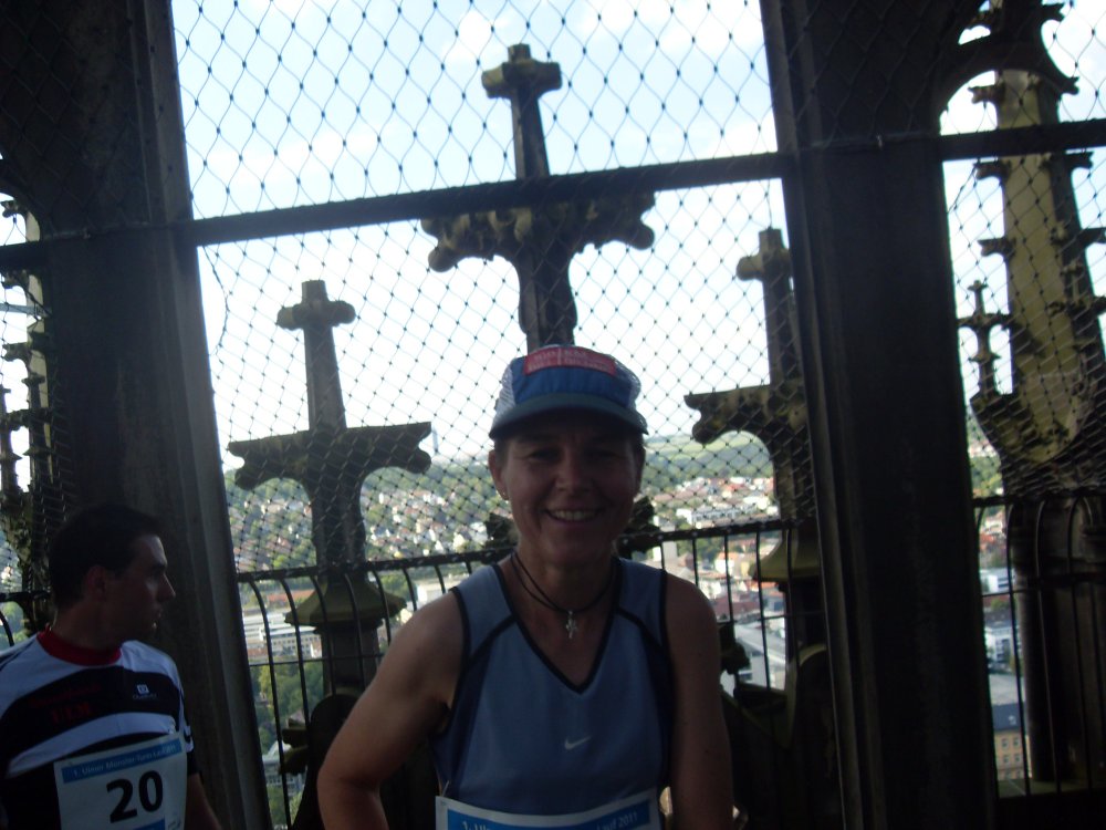 | ...im 30 sek. Abstand rennen wir los, Jörg wetzt um die Haarnadelkurve, ich denke daran: rein und nach links, renne los -vollgas- nach links, und dann schraubt es sich nach rechts in die Höhe, nach 10 Höhenmeter bin ich am Max Puls, sauge den Staub von etlichen 100 Jahren in meine Lunge, die Drehungen hören gar nicht auf, komm mit dem Schnaufen nicht hinterher, Quergang - gerade aus- nicht einfach wenn man gerade 500 Umdrehungen gemacht hat, zack- gegen die Wand geknallt. Und nächste Wendeltreppe, ich käuche-käuche, Drehwurm, weiß gar nicht mehr, wie ich die Stufen laufen?, gehen?, steigen soll???weiter, Sabine darf mich nicht einholen, ich bin ein gehetztes Wild, höre Stimmen, nach rechts! nach rechts!! renne weiter: nun halt! halt! Ziel erreicht, ich bin oben, total platt. Kurze Zeit später ist die "Jägerin" da..das "Wild" ist entwischt.... |