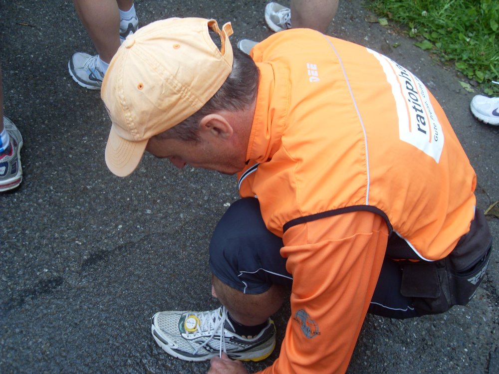 | ...jemanden getroffen vom Team! mich gleich als"Extern" entlarvt...Sekunden vor dem Start noch, oder nochmal die Schuhe geknüpft....Aufregung? kleines Steinchen?..jedenfalls freuts den Stephan.... |