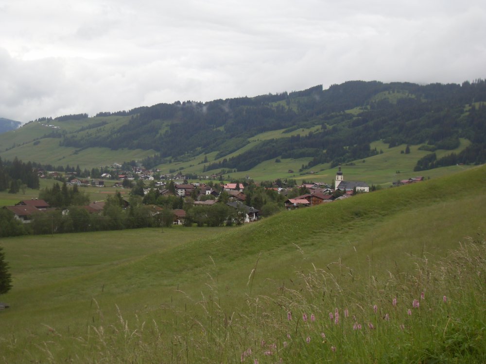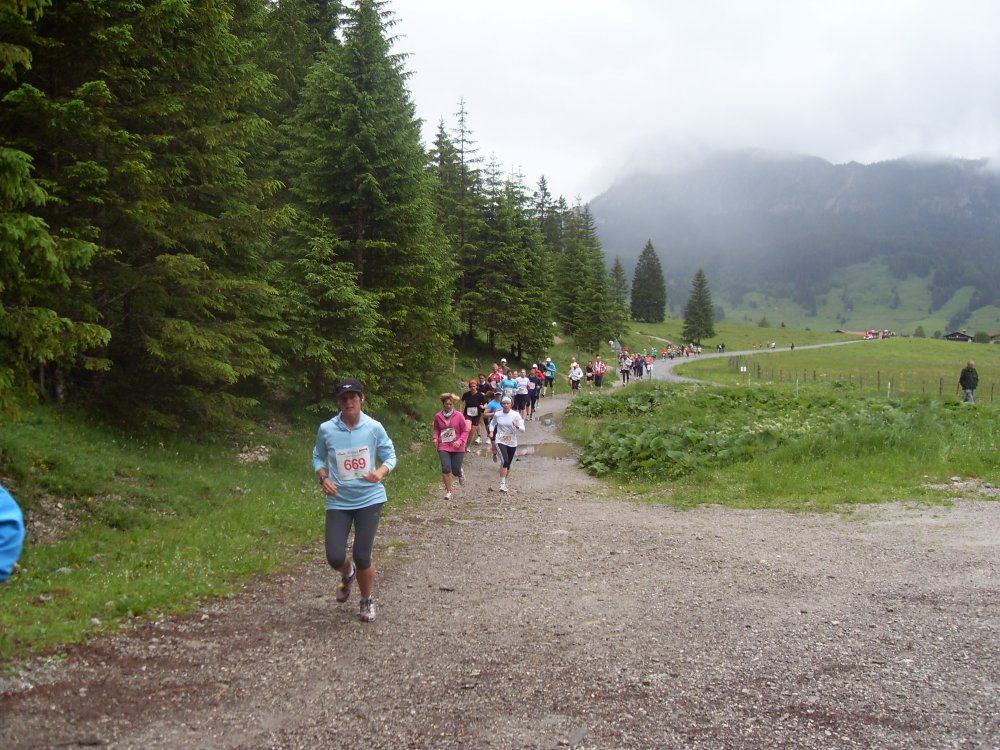 | ....und es zieeeeeht sich hinauf......Blick nach Tannheim....jetzt kommt der Trennungspoint: für die "Sprinter" links runter, für uns "Ultras" rechts...und wieder mächtig, steil "nooch oba"..... |